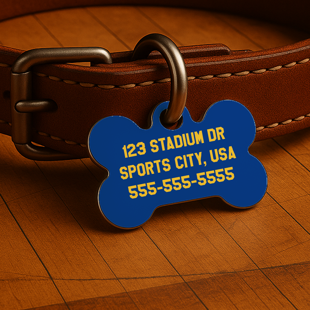 Printed with your pet’s name and contact info on both sides, this tag is waterproof, fade-resistant, and ready for fast breaks, neighborhood walks, or post-game naps on the couch.