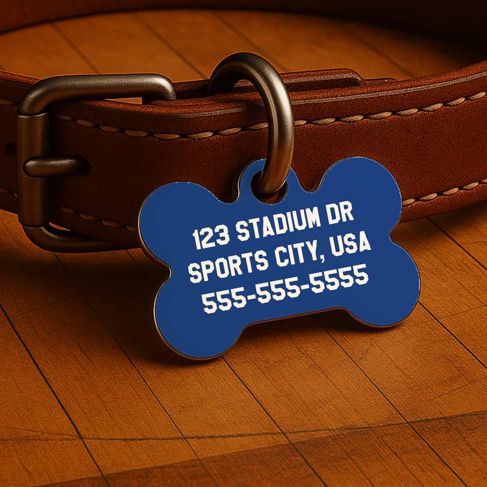Printed with your pet’s name and contact info on both sides, this tag is waterproof, fade-resistant, and ready for fast breaks, neighborhood walks, or post-game naps on the couch.
