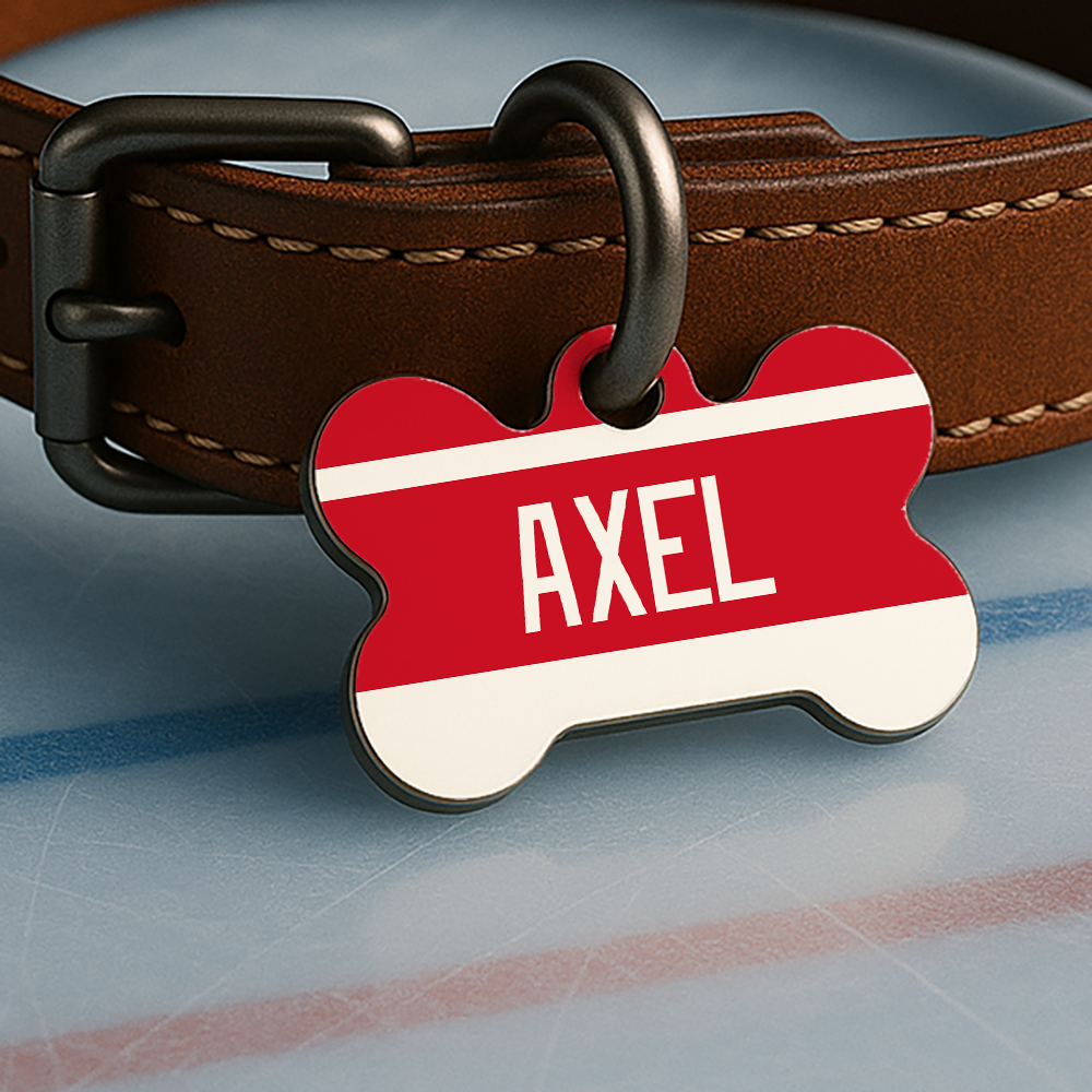 For pups who hustle like it’s the third period, this custom-designed, double-sided ID tag brings big energy without breaking any rules — inspired by classic hockey style and bold team color combos (no logos, just love for the game).