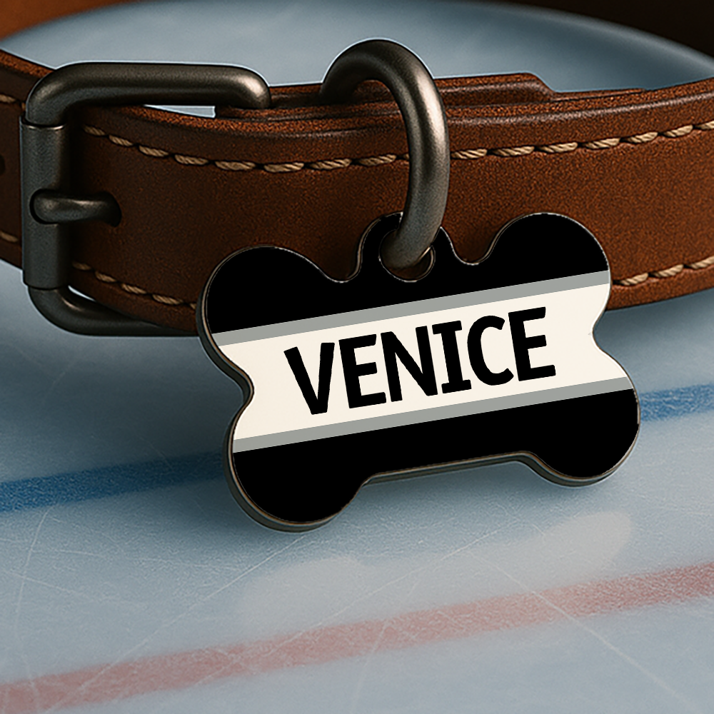 For pups who hustle like it’s the third period, this custom-designed, double-sided ID tag brings big energy without breaking any rules — inspired by classic hockey style and bold team color combos (no logos, just love for the game).