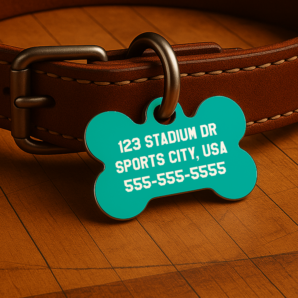 Printed with your pet’s name and contact info on both sides, this tag is waterproof, fade-resistant, and ready for fast breaks, neighborhood walks, or post-game naps on the couch.