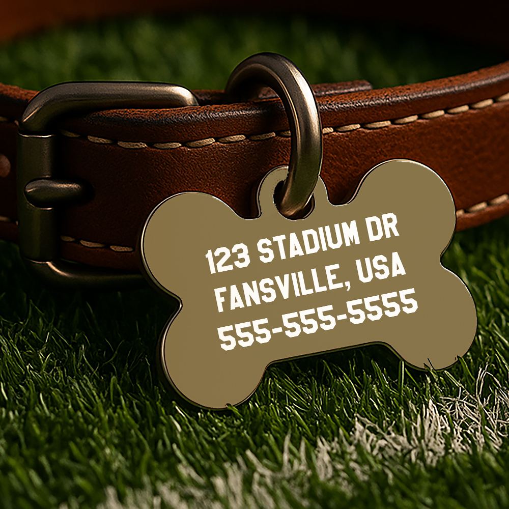 Whether they're tailgating in the backyard or napping through game day, this custom-designed, double-sided ID tag lets your pet show off their school spirit — no logos, just bold colors and classic vibes inspired by college traditions.